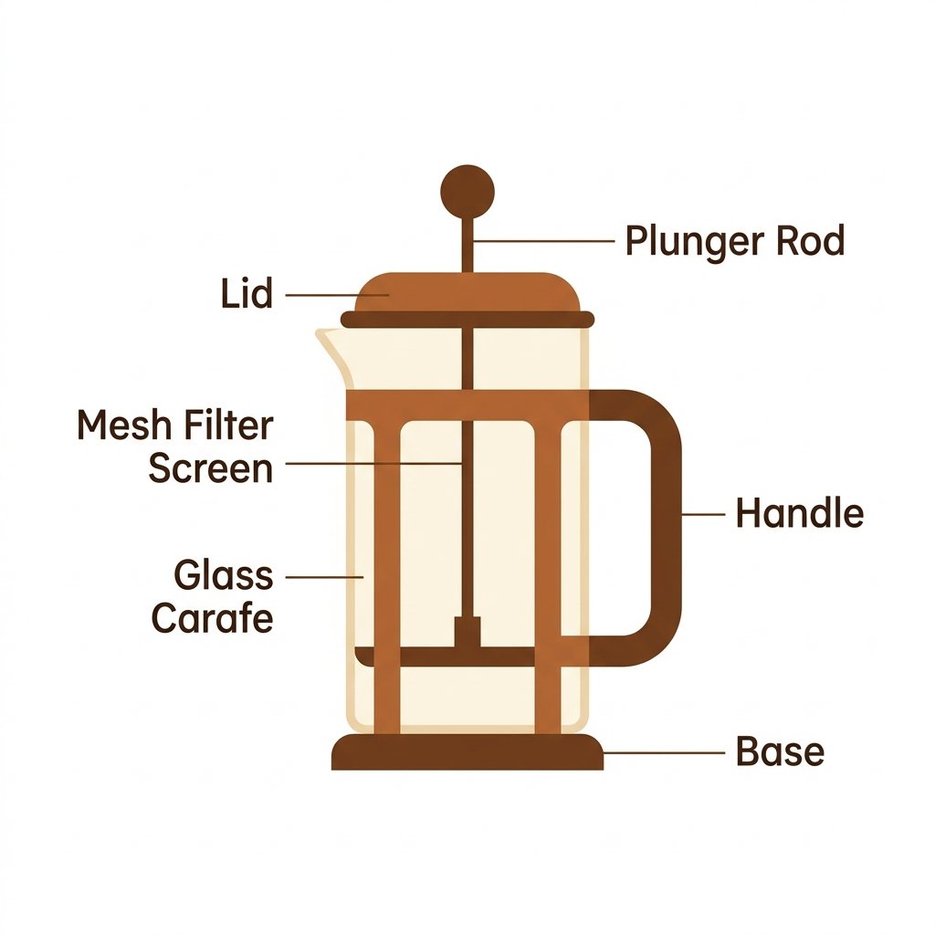 A French press is a manual coffee maker. There's no electricity, no pods, no paper filters — just a tall glass or stainless steel carafe, a metal mesh plunger, and a lid. You add ground coffee and hot water to the carafe, wait a few minutes, then push the plunger down to separate the grounds from the liquid. What's left on top is your coffee.
